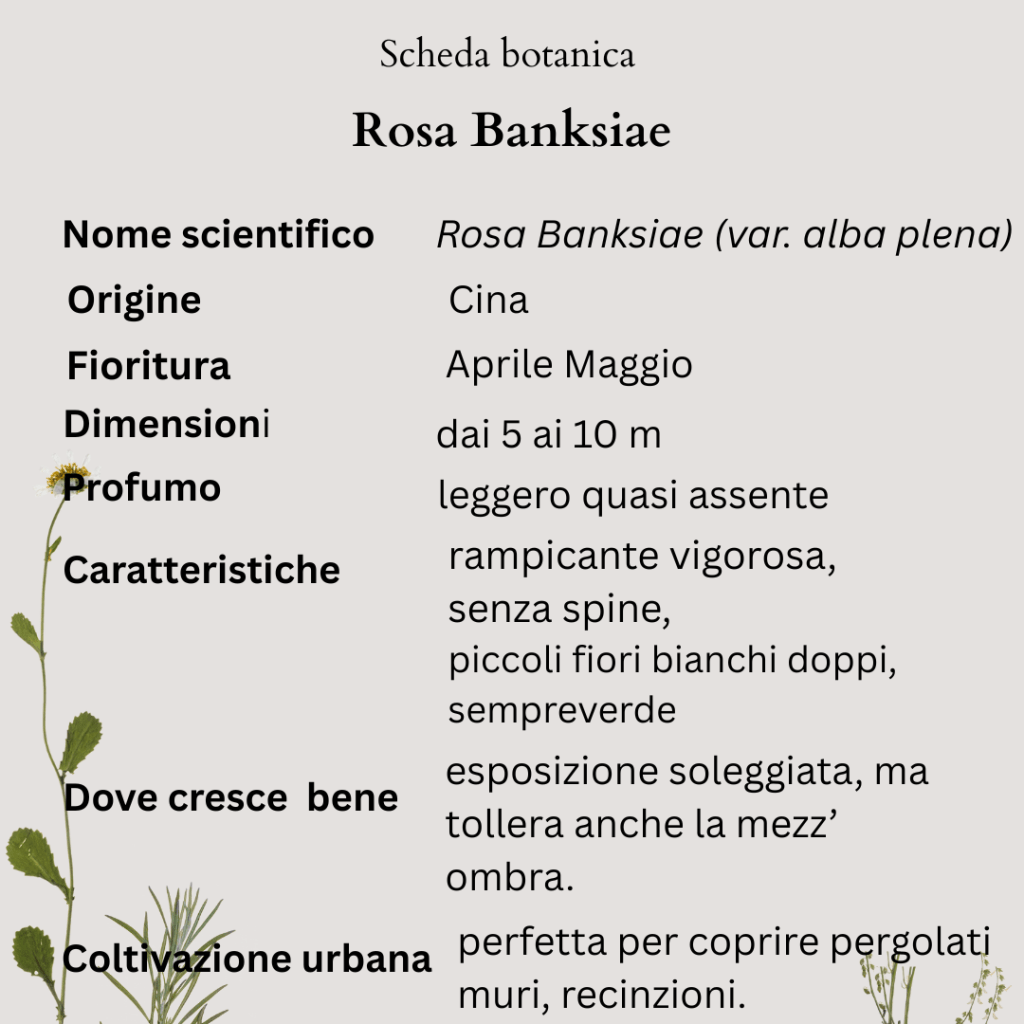 La Rosa Banksiae è una rampicante vigorosa, capace di raggiungere i 5–10 metri di altezza. Originaria della Cina, è arrivata in Europa nel Settecento e deve il nome a Lady Banks, moglie di un botanico inglese.