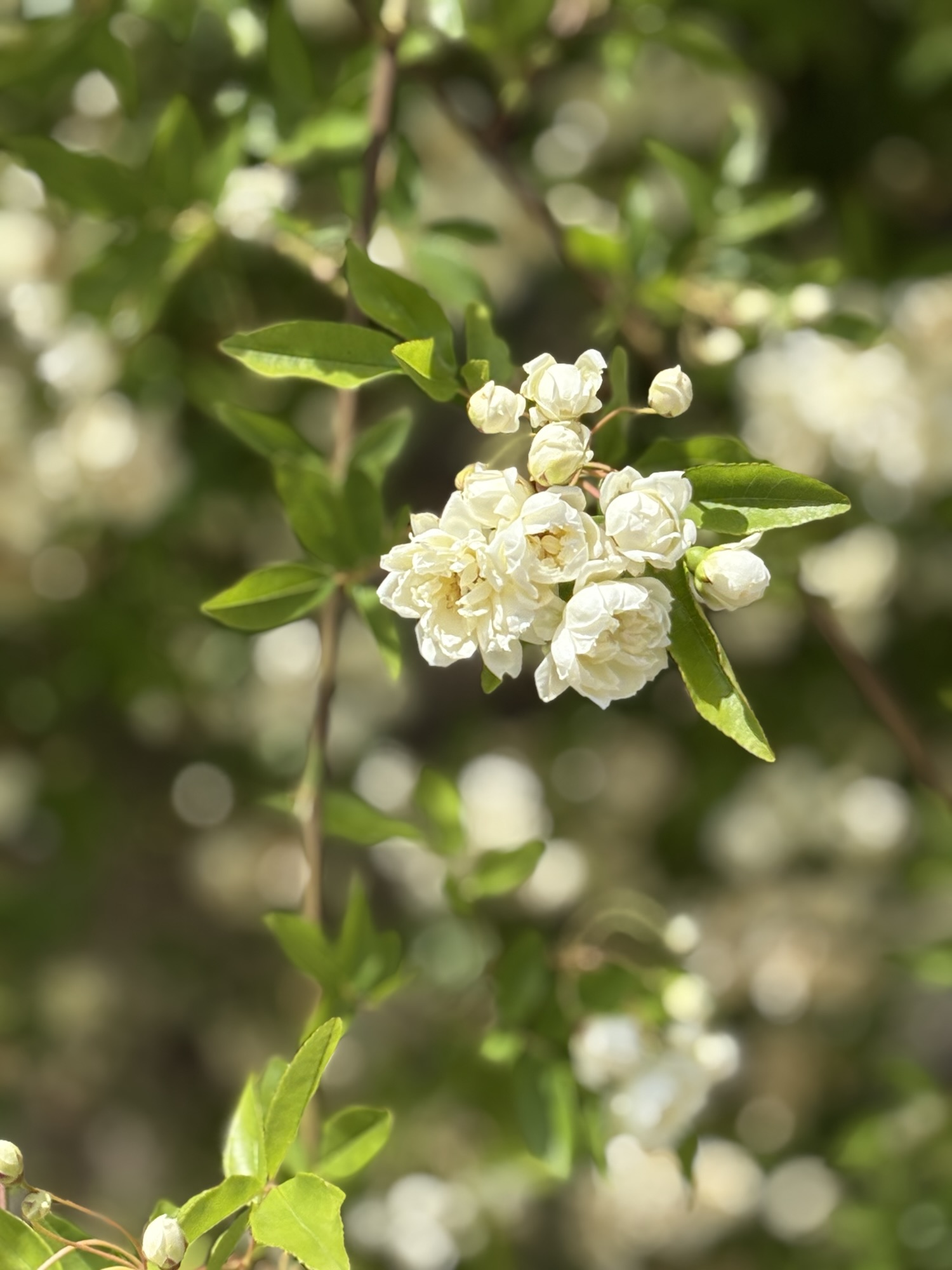 Fiorisce una sola volta all’anno, tra aprile e maggio, e lo fa con generosità: ricopre muri, cancelli, pergolati con piccoli fiori doppi, leggeri come carta di riso. Non hanno un profumo marcato, ma la loro delicatezza è ciò che resta impresso.