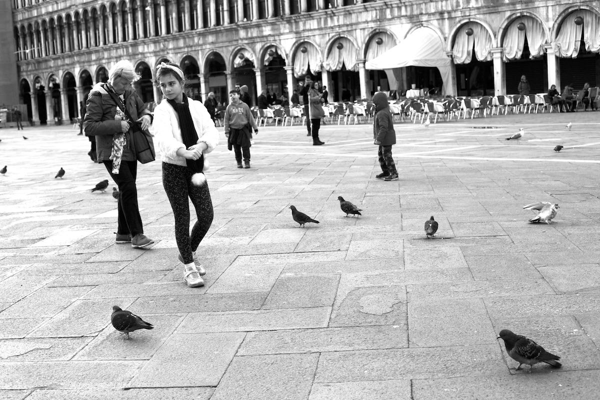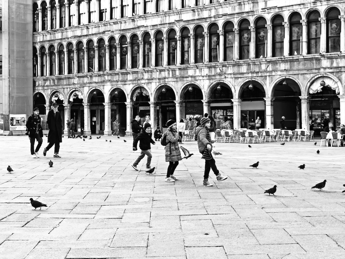 Piazza S.Marco, appare insolitamente sola, deserta, manca il sottofondo rumoroso della folla a cui eravamo abituati, i gabbiani, hanno ottenuto il loro momento facendo sentire la loro voce stridula, i bambini giocano spensierati nella piazza più bella del mondo.