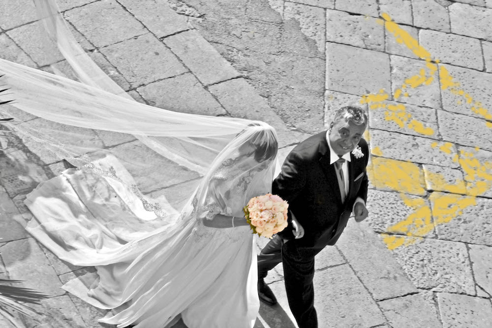 Ad un certo punto il padre della sposa, pienamente calato nel proprio ruolo, mostrandoci l’orologio, ci ricorda che è tardi è ora di avviarsi alla chiesa.