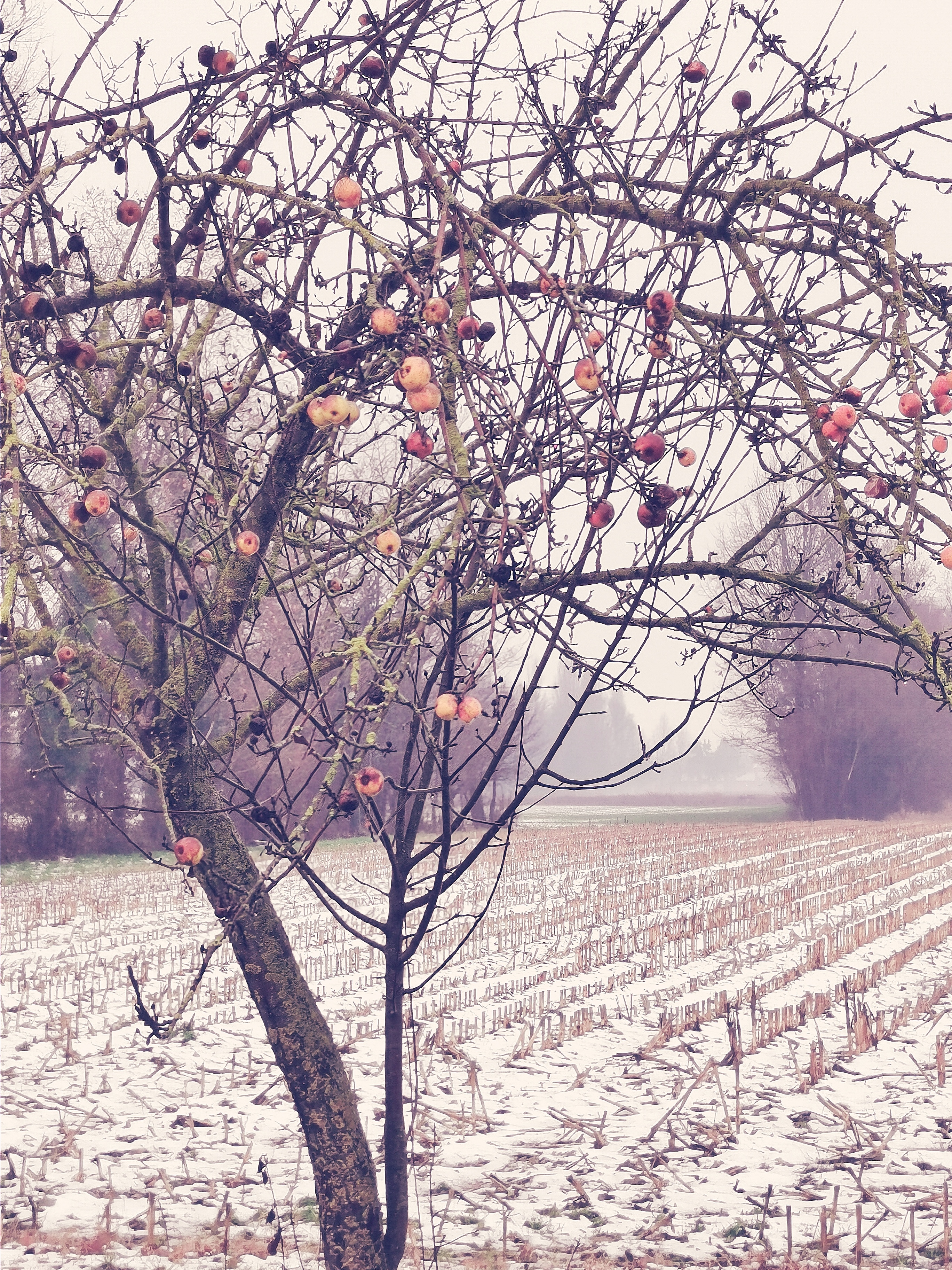 i rami degli alberi sembrano voler creare disegni in controluce, uno di loro conserva ancora qualche piccolo frutto, merli, pettirossi, cince , gliene saranno grati.