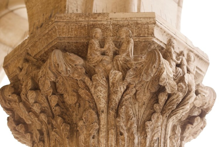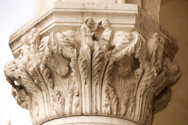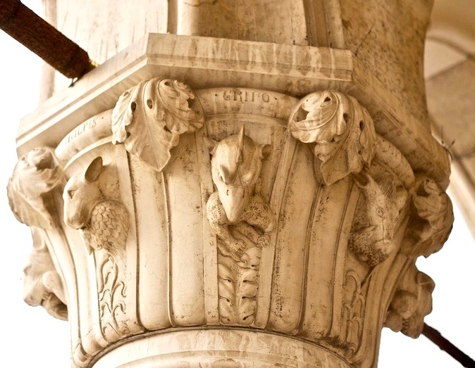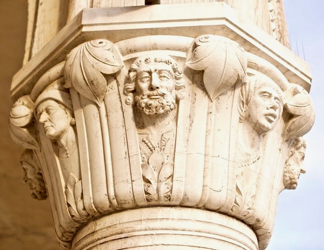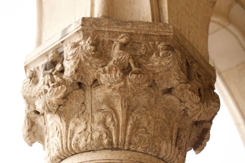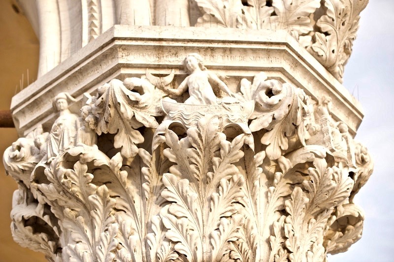 I capitelli come dicevo sono trentasei, alcuni descrivono le virtù come l’umiltà, l’ onestà la carità e la giustizia; quest’ ultima, poiché considerata la più importante, è raffigurata nel capitello maggiore vicino alla porta di carta (la più prossima alla Basilica di S. Marco) in particolare rappresenta Re Salomone con il bambino conteso dalle due donne.
